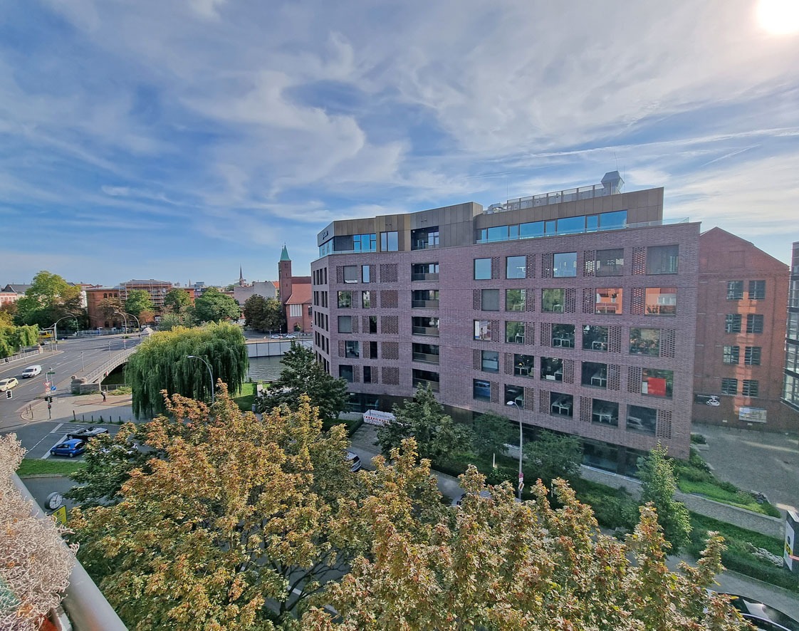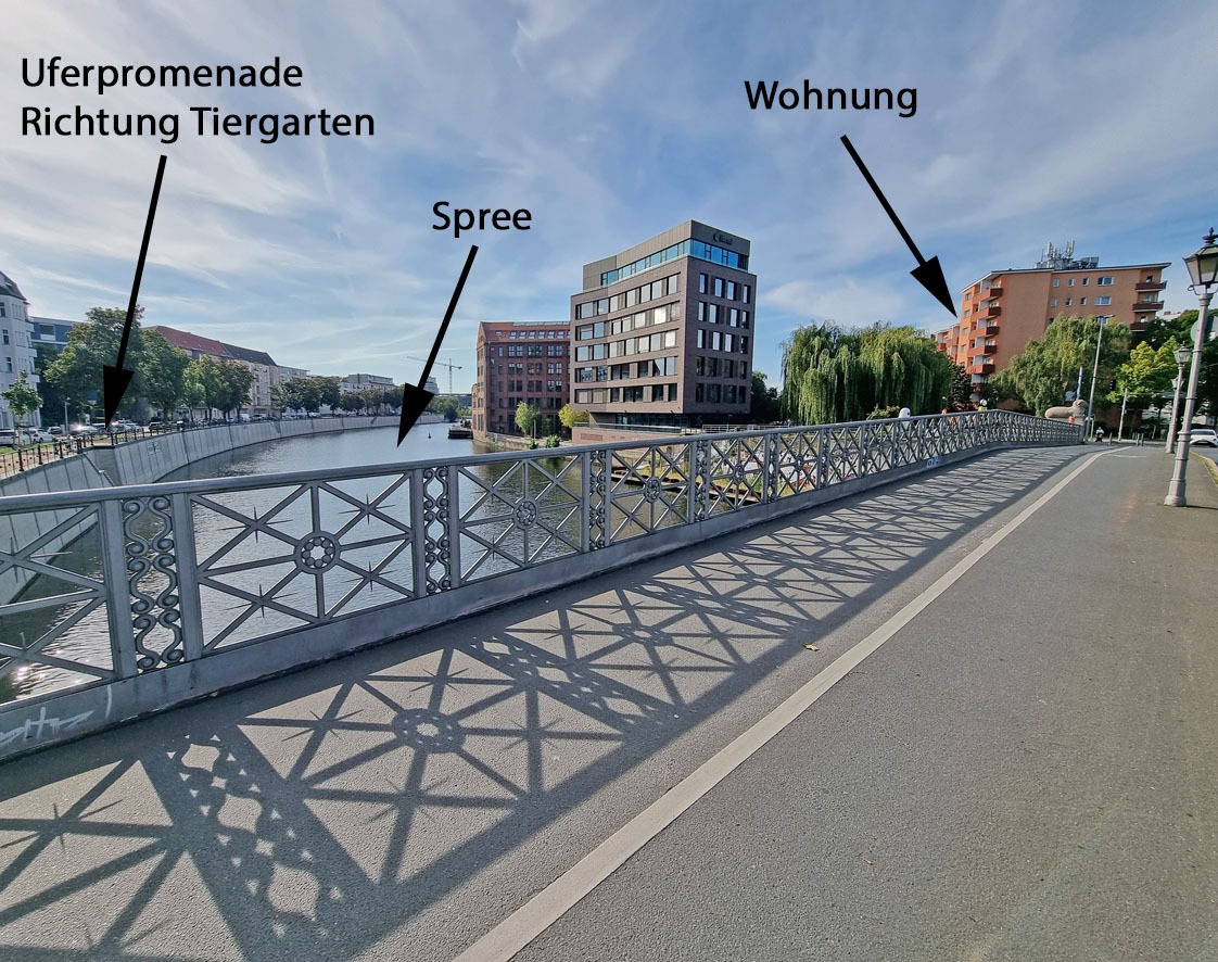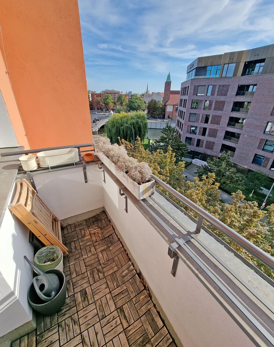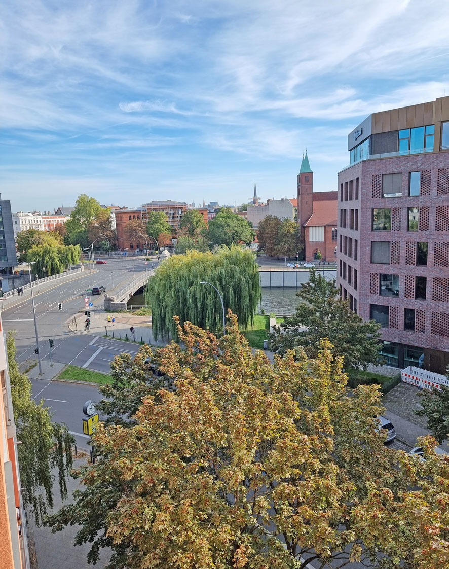 Vom Balkon in 5. Etage gelegen, genießt man den Blick Richtung Spree (Höhe Gotzkowskybrücke) mit grünem Ambiente.
