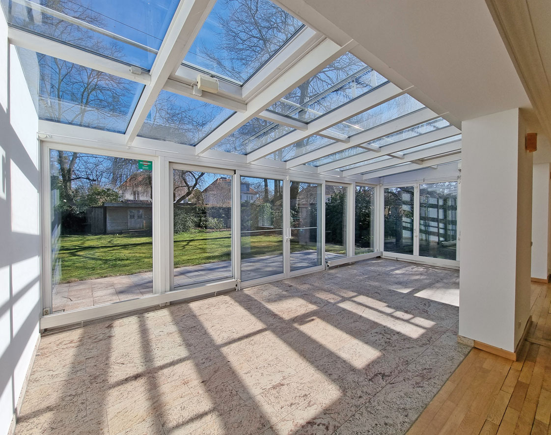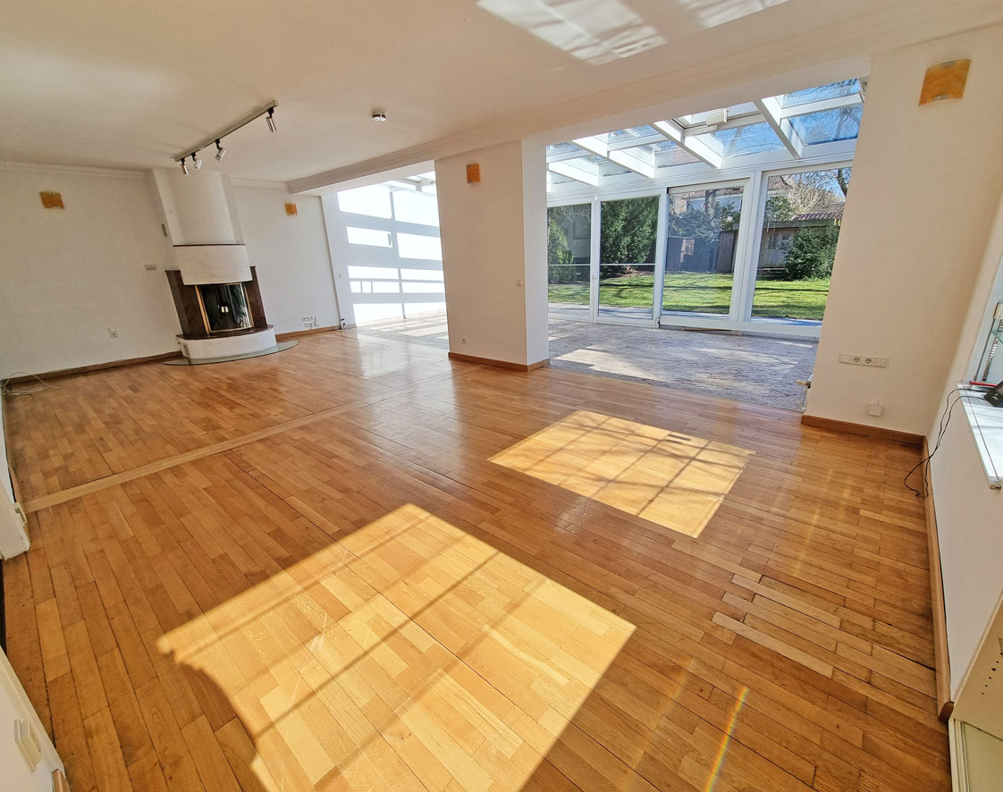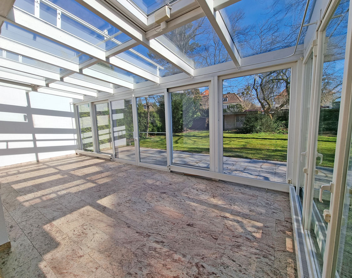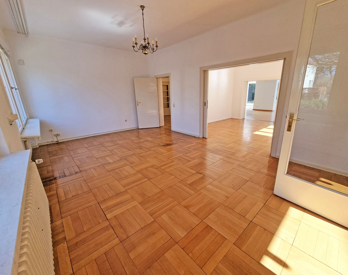 Nach dem Betreten des Haues durch den baujahrestypischen und charmanten Türbogen befindet sich ein kleiner Windfang mit seitlich davon marmorgefliestem Gäste-WC. Es folgt die herrschaftliche Diele als Entrée mit seitlichem Abgang zur großen Küche in U-Form. Von der Diele erreicht man den ca. 24 m² Raum 1 mit Anbau (Raum 2), sowie den Raum 3 (ca. 20 m²), welcher in den beeindruckenden und lichtdurchfluteten Anbau mit Raum 4 führt (ca. 43 m² mit ansprechendem Kamin). Dieser Raum bildet eine Einheit mit dem darin übergehenden beheizten Wintergarten (ca. 27 m²) und tollem Grünblick in den Garten. Die an den Wintergarten anschließende Terrasse im Garten erweitert im Sommer die "Wohlfühlfläche" noch erheblich.