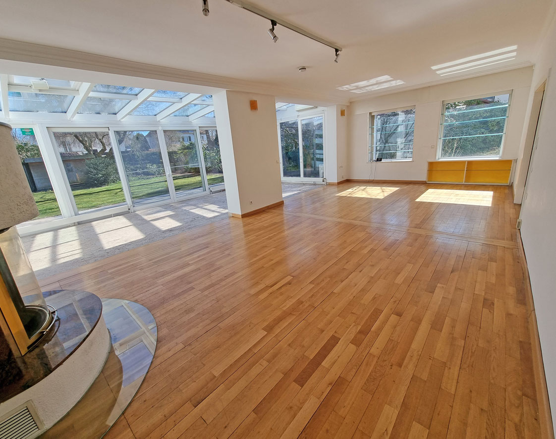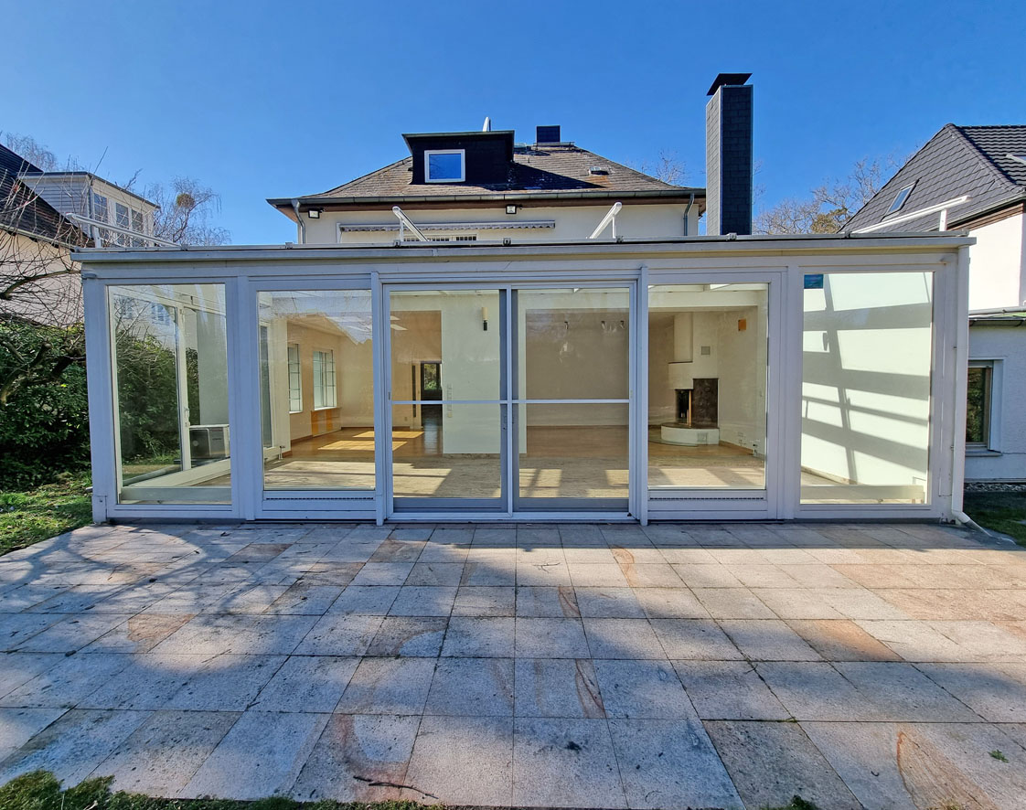 Das zunächst aus zwei Vollgeschossen, Keller und Dachboden bestehende Haus nebst Garage wurde später mit Anbauten im Erdgeschoss (Wohnraum Raum 4 mit ca. 43 m² und beheizter Wintergarten mit ca. 27 m² zum hinteren Grundstücksbereich / seitlicher Anbau ca. 7m²) auf ca. 150 m² Wohnfläche (im EG) erweitert. Auch der Dachboden wurde ausgebaut und verfügt dort über 2,5 Zimmer mit Wannenbad.